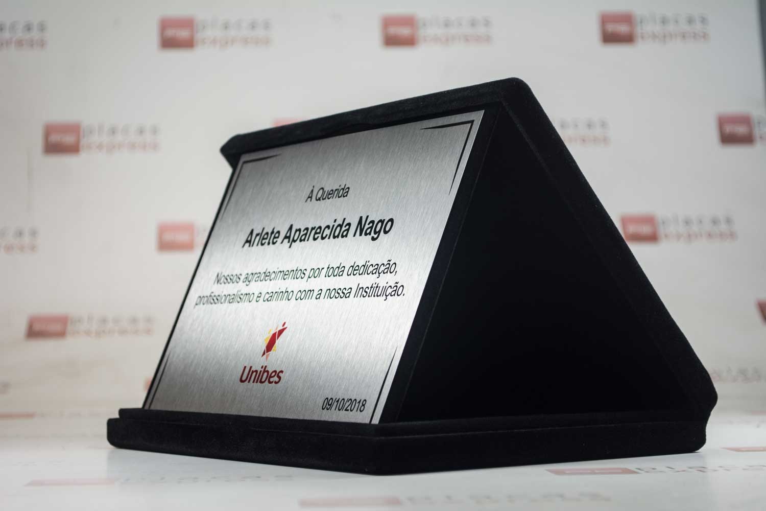 Placas de homenagem gravadas em aço inoxidável, acondicionadas em estojo de veludo .